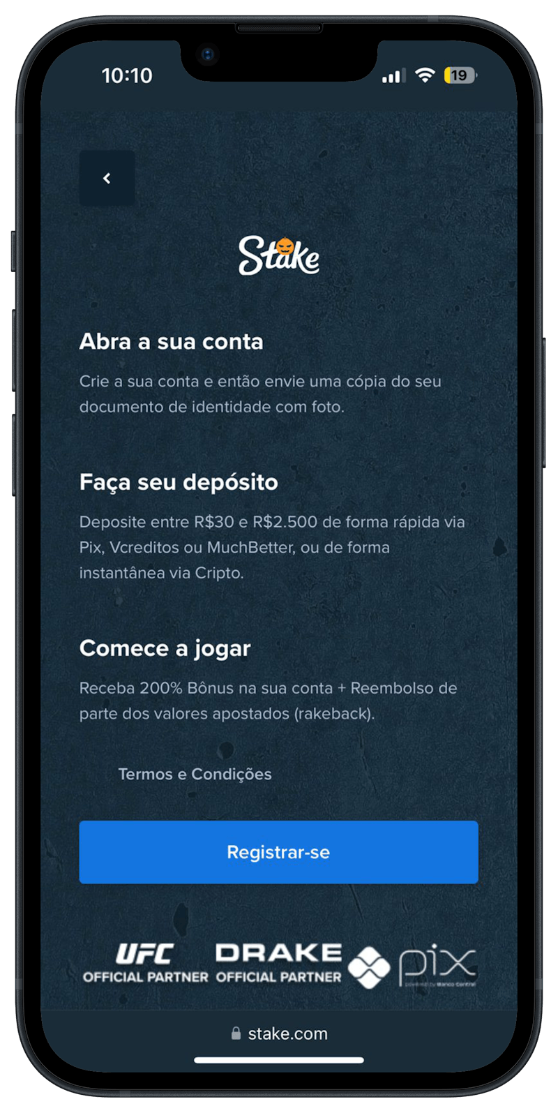 Clique no botão QUERO BÔNUS e acesse a página oficial da Stake. Na página do bônus Stake, clique no botão "Registrar-se".